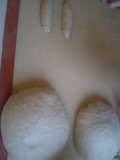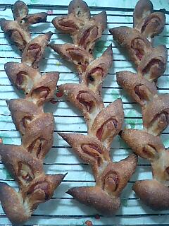お天気の悪い中、パン教室に行ってきました。膝の調子が悪くなってから、混雑時に人ごみに出ないようにしてましたのでちょっぴり不安。祝日なので、行き帰り どの電車も混雑に合わずホッとしました。この日はホシノ丹沢酵母と春よ恋ブレンドを中心に使った3つのパンの講習でした。 一つ目はコルドン。 小さい生地と大きい生地を丸め 小さい生地は紐状に、大きい生地はなまこ型成形にし 紐を逆Sの字にし、なまこ型の上にのせます。 クープを入れないのに、紐がクープノ役割を果たしてくれて きれいな裂け目ができびっくり。(@_@;) 2つ目はマイス こちらも、大きい生地と小さい生地を用意し 大きい生地を半分にカットし、そこにコーンとさいの目チーズを半分のせ 半分の生地をのせ それを半分に切り、、その上に更にコーンとチーズをのせ 切った生地を上にのせ、最後に残りのコーンとチーズをのせました。 小さい生地を包めるくらいの大きさに伸ばし 等分に切った↑を包み込みます。 焼き上がりは、こんな感じ あれだけ、あった中味が少なく感じるとのことでしたが 確かに、そうかも。 扱いにくかったのに極力打ち粉は控えたつもりですが、 私が作ったものは、なんか粉っぽい感じがしました。 3つ目はショコラカンパーニュ これもホシノ丹沢酵母を使い、国産小麦にオレンジピールを 混ぜた生地を一次発酵。 丸く伸ばし、アーモンド・マカダミアナッツ・バトンショコラをのせ なまこ型成形。 木の葉型のクープを入れ焼きあがったものです。 子供たちの感想は、チョコレート入りのものは イーストのふわふわパンの方が合う様な気がするとの事でした。 私もハード系のパンにチョコ入りは苦手です(^^ゞ。 夕飯に頂いたコルドンですが、既にぱりぱり感はないものの、 トースターで焼き 厚くクリームチーズを塗りったくり 頂きました。何も入っていないのに、とても美味しい(*^。^*)