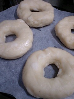 先日、ブログ仲間のゆ--こりんさんが『30分で出来るベーグル』を紹介されてました。ベーグル作りって、めちゃくちゃ面倒くさそうだから、とても手作りは無理と思ってたのに・・・たった30分で!??と半信半疑ながら、私もチャレンジ~紹介されてたレシピは手捏ねだったけど面倒だったのでHBのパン種コースを利用して機械任せに~(^m^)成型後、片面1分ずつ茹でて、15分オーブンで焼いたら出来上がり~♪本当に30分くらいしかかからなかったけど、モッチリとしたベーグルが出来ましたよ~\(^0^)/さっそく、スモークサーモンとレタス、スライスチーズを挟んで、サーモンベーグルに♪家族にも好評でしたゆ--こりんさん、素敵なレシピ、ありがとうございました
