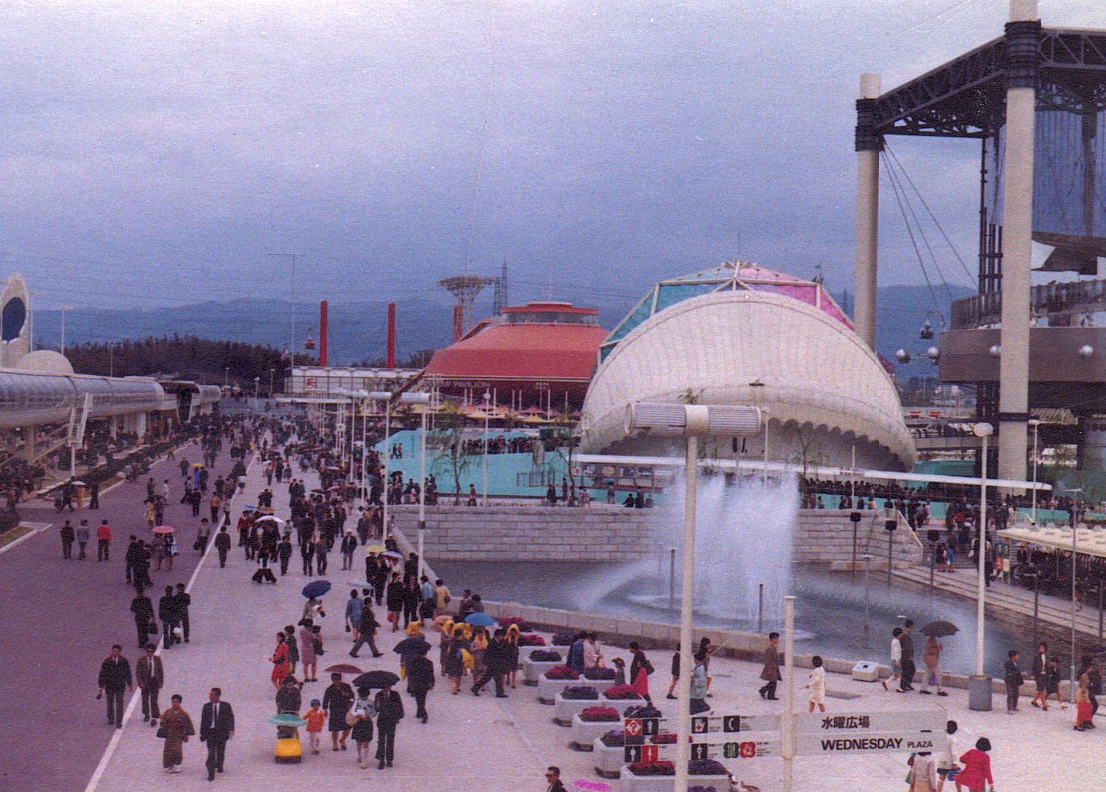 左から東芝館 三井グループ館等 個性的な形のパビリオンが多かった
