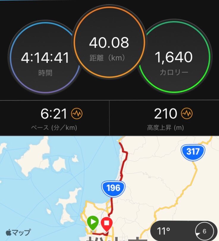 今日の体重46.6kg 体脂肪率15.2% iPhoneの基本動作 まだ全然慣れなくて 四苦八苦 何よりもまず 今一番困っているのは GarminのBluetoothが iPhoneに接続できないこと。 マニュアルを読み実行(何度も) GarminのHPに書いてあることも全部試し それでもつながらないので もうお手上げ。 息子にも手伝ってもらったけど 解決しませんでした。 こうなったら Garminのサポートセンターに電話するしかないなあ と思っています。 土日祝日はお休みなので 明後日以降に(泣) 昨日は40k走りました。 主に愛媛マラソンコースを。 沢山のランナーが走っているかと思いきや それほど多くはありませんでした。 3連休初日だから? 遅いスタートだったから(11時)? 今日明日は多いのかも。 一緒に走ったのは 愛媛マラソンを走るランナーさん4人。 22歳の女子から還暦のオジサマまで。 走るとなると性別も年齢も関係ないというか それがランニングの楽しいところ♪ 私はアキレス腱が気になり 3日間ランオフした後での40k 恐々走り始めて… 走れなくはないけど 終始違和感あり。 アキレス腱周辺が張っている。 しっかり力が入らないので 最後まで走り切れるかな~と心配 幸い痛みが出るということはなく なんとか40kいけました。 で、一夜明けた今日はというと 特に何も変化ない感じ。 拍子抜け。 痛みは無し。 ん…これはどういうことか。 やっぱりあまり走らないほうがいいのかな。 なんか恐ろしく不安になってくる 愛媛マラソン4週間前 今日はひたすら iPhoneのお勉強。 あー肩凝る疲れる。