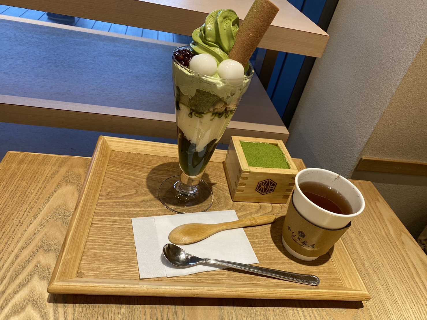 京都の河原町にある抹茶館では、このパフェやティラミスを食べるために行列になっていますが、ここは混雑なく注文できるので穴場だと思います。