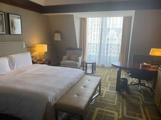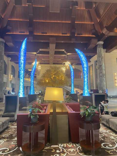 リゾート感いっぱいのホテルでプールも大きくて楽しめました。遠くに見えるのは青島ビール祭りの会場です。