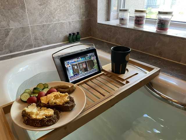 大連シャングリラホテルでお風呂に入りながらの朝食です。タブレット端末で日本のテレビを見ながら優雅な朝食をいただきました。