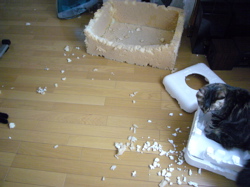 マイブーム。。。どこのおうちのネコさんにもきっとマイブームってあると思うそれがおもちゃだったり、ごはんやおやつだったりいろいろだよね。りんご家のにゃんずのマイブームは、今まではそれぞれバラバラだったのに今はみんにゃ気持ちはひとつ?みたい。気持ちがひとつというのはいいことだけどりんご夫婦にとっては毎日がため息の連続それでは我が家のにゃんずのマイブームをご紹介我が家には2階にファミリールーム(このハウスメーカーではこうよんでいる。)があるの。いわゆる多目的なスペース。ここが今、我が家のにゃんずの社交場化となっている。社交場なんて聞こえがいいけど。。。実はその実態は。。。。ファミリールームはゴミだらけ。。。 左の変な物体は元はペット用ベッド。。これが元の形。カバーを洗濯して、スポンジのベッドをそのままにして置いておいたら。。。ボロボロになってしまったの。。。2階のファミリールームはこの噛みちぎったスポンジと発砲スチロールだらけねえねえ、樹羅。。。これ誰がやったの?樹羅『ぼくはしらないよぉ~。ふわぁ~、眠いでちゅ。。。』ねえねえ、ミント。。。これは誰がやったか知ってる?ミント『今日はいいお天気だよね♪』お~い、散らかしてもいいけれどかたずけてよ!!毎日毎日、お掃除三昧ですぅ。。。犯行現場を撮りました。発砲スチロールで遊ぶミント&伽羅をみてね。*** *** *** *** *** ***マゼンタさんちのナナちゃんへたくさんのメッセージをありがとうございました。先週末からなんだかんだと忙しく、コメントへのお返事ができなくてごめんなさい。ナナちゃんはお空にあがるまで、きっと大好きなお父ちゃんとお母ちゃんのそばにくっついているんでしょうね。。。