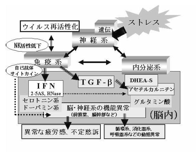 慢性疲労症候群について2009年の初めに、慢性疲労症候群の専門医を受診しました。この病気は線維筋痛症と根っこは重なっているので参考になります。脳脊髄液減少症のこじれたパターンや、高次脳機能障害(記憶低下)や、他の重病からこじれてしまった人にも参考になるでしょう。『まず心因性では絶対無いです。』『心へのダメージの大きさからはじまりますが、心因をとりのぞいてもあまりよくならないので、気の持ちようなど思わない方が良いです。』『心臓や腎臓の基礎疾患、交通事故などから、疲労状態になる方もいますが、基礎疾患についてあらゆる治療を受けているにもかかわらず激しい疲労状態から抜け出せない事例もあります。全て気の持ちようや行いが悪いのではありません。』『慢性疲労状態の患者の内、原因が特定できたのは僅か4割です。別の病気から始まり基礎疾患が判っている人も、不明なカラクリに巻き込まれる事例が多数あります。』『きっかけがどうであれ、免疫系、自律神経系、内分泌系に『広く』『深く』『複雑』に絡まった病態である。』☆解決に向けての答えは『複数分野の専門家』と『患者と周囲』のネットワークです。単純な足し算ではなく掛け合わせ的発想です。(なぜなら敵の正体が広く深いネットワークなのですから、目には目を、ネットにはネットです。)自分なりに噛み砕いているので、不正確なところもあると思いますが、できる範囲で参考にして下さい。慢性疲労症候群を中心に「多様な症状のある慢性的な疲労状態について」は、おぼろげな実体を想像できるまでになりました。霧に包まれながら、いつも症状に悩まされる点では同様です。けど☆☆不安を感じる点は減り、具体的な配慮あるアドバイスも増えてきています。(例)「この症状は辛いけど、そのすぐ先に重大な病気が待ち構えているわけでは無い。ただしこの数値がこれを超えるようだと、その専門家に診てもらおうか。」☆自責の念にかられる必要は無くなり、少しずつですが休む事が堂々と行えるようになってきました。→「重大な検査結果の悪さは無いが、決して気のせいではない。休んだほうが良いという警告サインだから、黄色信号が多数=赤信号と考えよう。」☆僅かですが、霧の晴れた部分があります。典型的な慢性疲労症候群であれば、西洋医学+東洋医学+ビタミン類の活用で症状緩和の確率は上がってきています。周辺の類似症状も、霧の深い方向を避け、霧の薄い部分へとすすむ道標を立てる。慢性疲労症候群の典型例と自分の共通点と違う点を見比べ、漢方薬・サプリ・食事療法に関する情報量も増えてきています。今一度、断言しちゃいます。「心因性の病気では無い」事は明確です。●「心への多大なダメージが最初の原因のパターンが多いです。A相応のダメージを受けた人、B遺伝によりダメージを受けやすかった人、どちらもなる。」多分そうです。でも極限にこじれた疲労は、社会的なストレスを除去しても、病気の本体は「当初の分野」から広がり深く根を下ろします。どこへ?●「不可解な多愁訴は三大系統が複雑に絡まった変調から来ている。」多分そうです。どこへ?の答えは「3方向へ」●まず進むのが免疫系統へという確率高いです。仮説のシナリオのあらすじは序章「免疫低下から、様々な感染症にかかりやすくなる。」本編「免疫系を立て直すために過剰に放出されたサイトカイン(インターフェロン・TGF)のある種類が脳神経系に障害を与えているのでは無いか?」●以下序章と本編をエンドレスに繰り返す。◎2005年時点でも保険診療異常の少し踏み込んだ特殊な検査をすると。→氷山の一角が見えます。a:ヘルペスウイルスの類の再活性化あり。b:NK活性の低下あり。c:種々のサイトカイン異常あり。d:神経伝達物質の受容体に対する抗体の出現あり。e:血清コルチゾールの減少あり。f:尿中カテコラミンの上昇あり。g:抗利尿ホルモン基礎値の減少あり。h:DHEA-Sの減少あり。i:アセチルカルニチン代謝の異常あり。j:前頭葉機能障害などさまざまな異常がみつかってくる。◎交通事故でも、社会的なストレスでも、大抵調べてみると先ほどの仮説のシナリオを実証する結果があちこちで確認されている。※総合医が不在で、自公の医療・福祉切捨てで、スタッフ全体が多忙でという社会的な弱点をついてくる性格が病気の本性です。※「全ての医療者は単独では救世主とならないが、外科・内科。西洋東洋全ての現場と各学会での最新研究成果が全てヒントとなり前進につながりうる。」※「全ての検査数値は赤ではないが青でも無い。広く多数の黄色である。黄色がたくさん灯っている系統に本体の半分が潜り込んでいる事がヒントである。」※「その分野に理解者が1人でも見つかると心強い。後は正反対の分野に支援者を見つければ泥沼への沈み込みはふせげる。」そんな風に思いました。お大事に