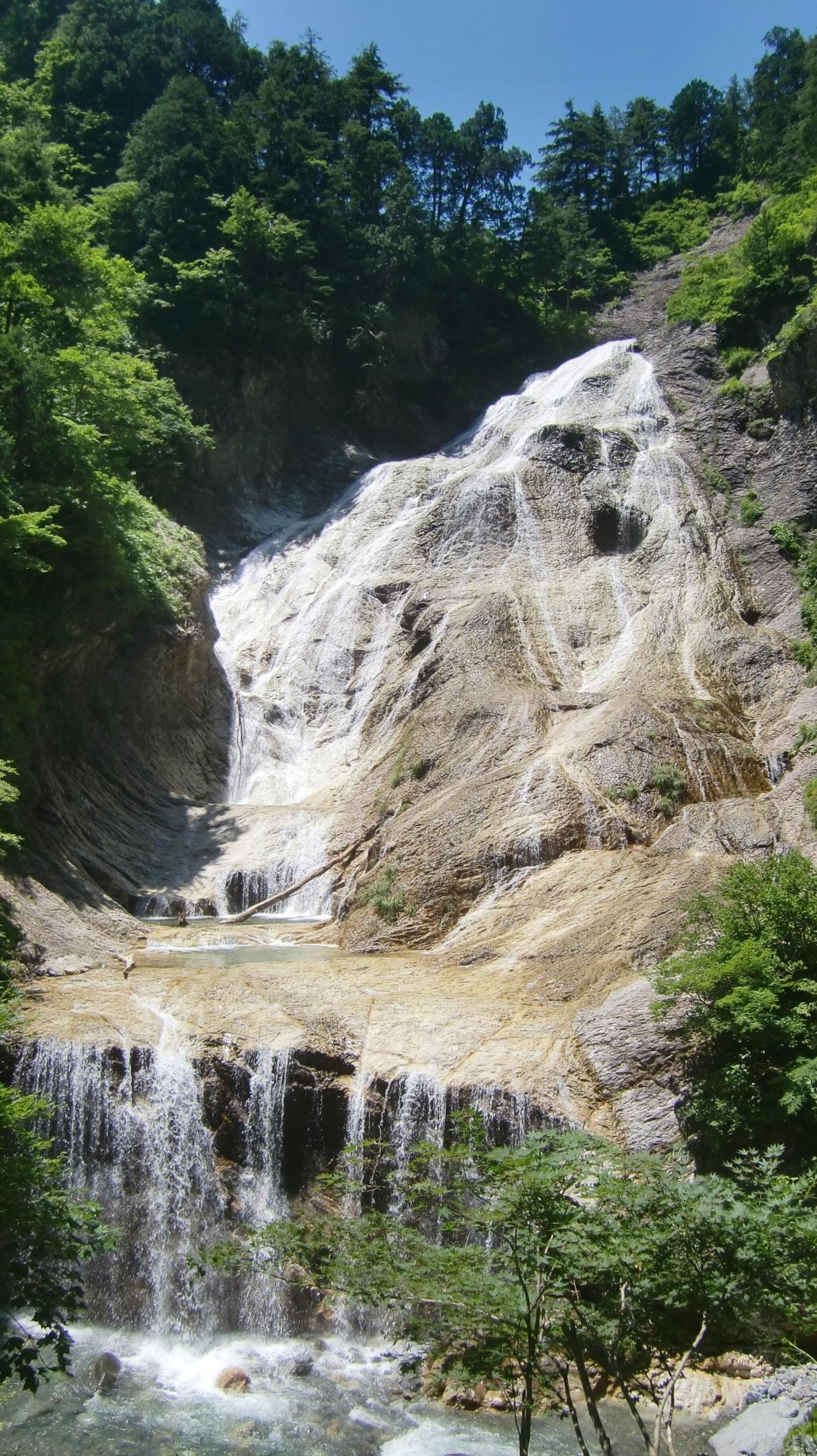 落差111 mの岩肌をなめらかに流れ落ちる滝である。