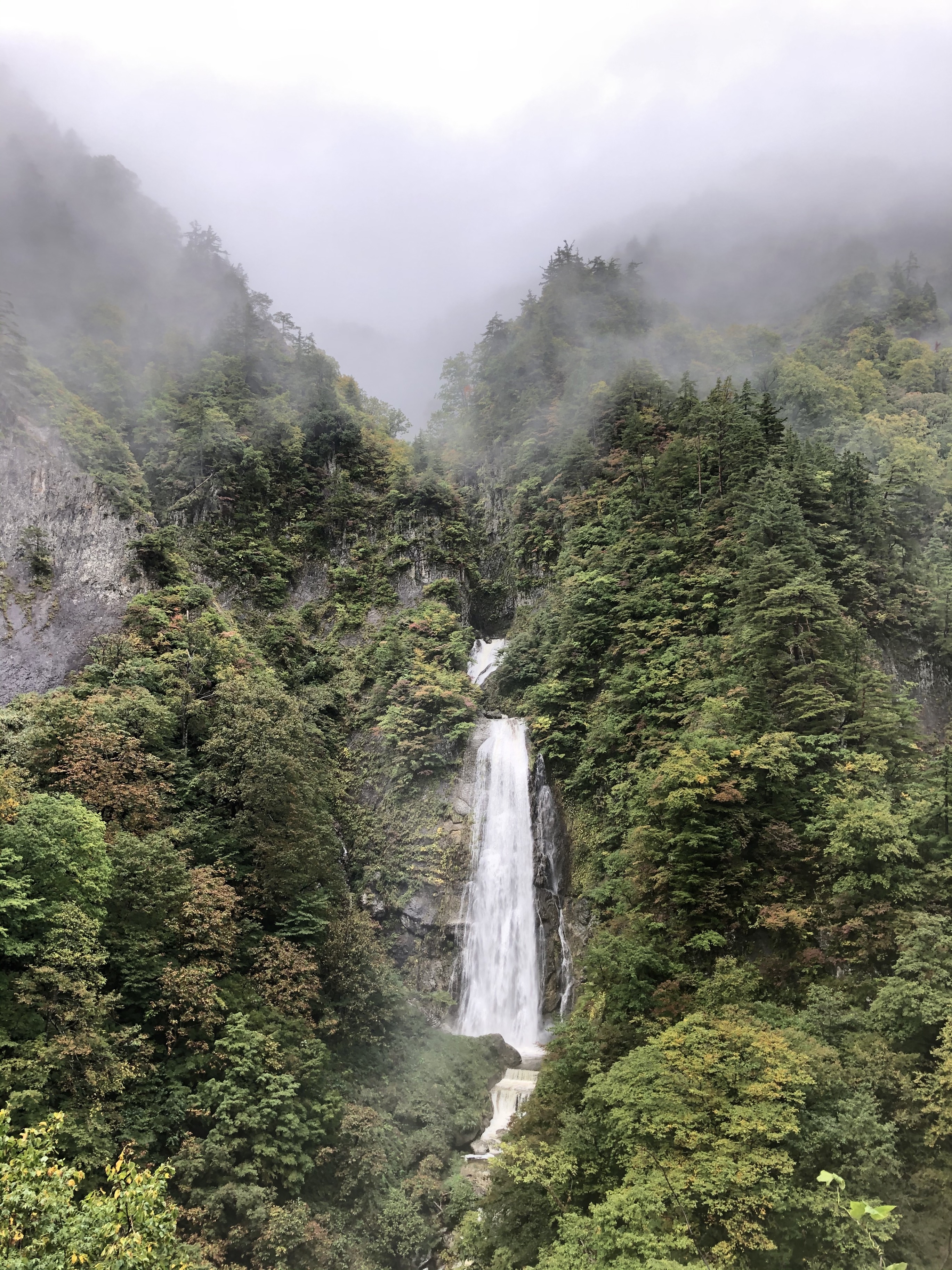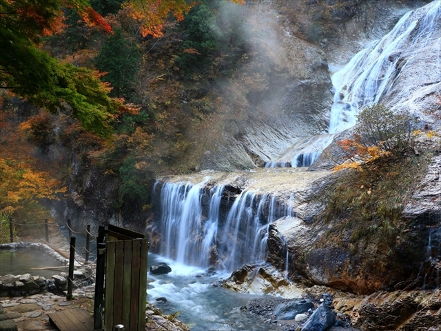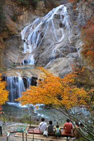 歩くと滝の真下へ行くことができる。親谷の湯で足湯と露天風呂を楽しみながら鑑賞する