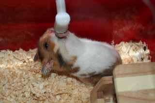 ゴールデンハムスターぷりりん♂が我が家に来て4週間たった。先週から体形の変化に気づき気になり始めた。肛門の周りが円形座布団みたいに腫れてきた。なんだろうと思って図書館から借りてきた本を読み直したらわかった! 「生後3ヶ月ぐらいの♂はお尻が腫れてくる。睾丸が陰ノウにおりてきて腫れたようになる。」と書いてあった。なんだ~、男の子のしるしだったんだ。本にはタヌキの置物のようだと書いてあり、まさしくその通りだ。でもタヌキの置物と一緒にするなんて失礼だ。あと、本には睾丸は体温調節の役割もしているとあった。じゃあ、女の子ハムはどうやって体温調節をするんだろうと疑問を持ってしまった。 横から見てもぷっくりしているのがよくわかる。歩くときも引きずっているようだ。なんか、かわいいそういえば、イラストのある飼育本でもしっぽの付け根辺りをオスメスで書き分けている本があった。