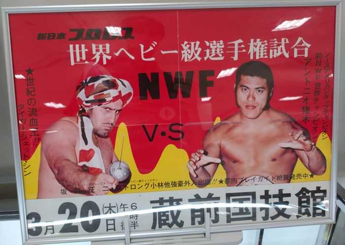 試合のポスター。会場の「蔵前国技館」が時代を感じさせます。猪木が挑戦者になっているので、タイトルを奪われた後のリターンマッチなのでしょう。NWFも「世界」ヘビー級となっています(後年、「世界」が外されました)。