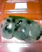 食ネタ2連発(暇人)。スイミング帰りに青葉台スクエアの地下を物色しに寄ってみました。いつもは楽器を持っているから重くて買い物する気力なし。練習のない木曜日の密かなお楽しみでございます。金食い虫が棲んでいるからあまり頻繁には行けないんだけどね…。ウロウロしていたらサークルのお友達に遭遇。今まで2度しか会っていないのに、声を掛けてくれてうれしかった。ちょっと立ち話して別れる。お友達と会ったその場所に期間限定で来ているお店が出ていた。ちょっと目を引く品物があった。お値段は微妙なライン。しかし、ショーケースでおいしそうに並んでこっちを見ている(違)。お買い上げ。微妙な値段なので頭数では買えませんでした。1個あたり30円くらい安かったら、しっかり4個買ったんだけどなあ。『黒豆くずもち』という品物です。ショーケースではとてもおいしそうだったけど、やや気味が悪いぞ。パックに入っているからいいが、これが直にテーブルに乗っていたら変な生物と勘違いして絶叫してしまいそうだ。でもね、味はとってもいいんです。口当たりというか、のどごしもいい感じ。つるん。もちもちプルン。またどこかで売っていたら買いたいな。