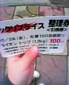 かいとを送ってはづきと買い物へ。バスに乗って田奈の三和&パシオスでも行こうかと思っていたが、はづきに聞いたら「ユニーいくの♪」と言われる。いつもなら乗りたい大好きなバスも拒否。どうしてそれほどまでにユニーへ行きたいんだろうか。ユニーに着いたら開店前。大勢の人がいる。異様な光景。何かと思ってお店の人が配っていた券らしき物を見せていただく。ふむふむ。これなら私もいただいておくか。はづきの手ですw私の経験では198円が底値だと思われます。それのほぼ半額。名前と匂いで花王のビーズが好きだが、安ければ何でもいいのさ。ほどなく開店したので店内へ侵入。食品売場にまた意味不明な行列。普段は列や待つことが嫌いな私なのに、なぜか並んでしまったり。辿り着いたのは卵売場。M玉が1パック98円だった。確かに安いけど、こんなに行列してまで買うほど安くない気が…。ま、いいか。会計を済ませてからトップの特設売場へ。すでに袋に入って出来上がっている状態に笑ってしまいました。無事にお買い上げ完了。そして、魚兵に寄って家に帰る。開かずの間で探し物をしていたら、未開封トップが2箱発見される。…なんでやねん(涙)。