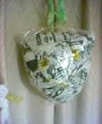 幼稚園バッグから奇妙な物体。また変な物を持って来たか…。先週も「はーちゃんにおみやげー」ってうれしそうに言いながら空き箱に角の生えたような変な物を持って来たしなあ。しかも、「いらなーい」と一蹴され、即ゴミ箱に捨てられてたし(爆)。よくよく聞くとてるてる坊主なんだそうで。明日は幼稚園で焼き芋大会をやるから作って来たらしい。そっか、じゃ、吊してやるか。見えにくいけど、黄色のマジックで顔が描かれています。ビニール製でどちらかといえば雨仕様になっている気もするが…。ちなみに、左下にこそっと写っているのは運動会の前夜に作ったてるてる坊主です。薄毛で細目、はづきをイメージして描きましたw異様にブサイクです。明日は晴れるといいね。できればあさっても晴れて…いや、降らないで欲しいんですが。