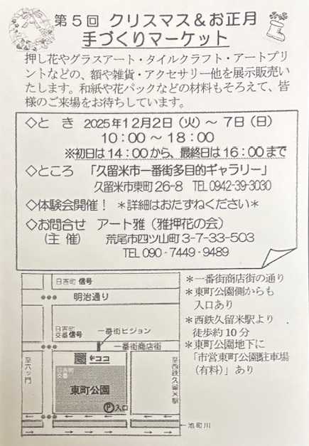 雅の会・クリスマス&お正月手作りマーケット 今年も、もう12月!! 明日12月2日…
