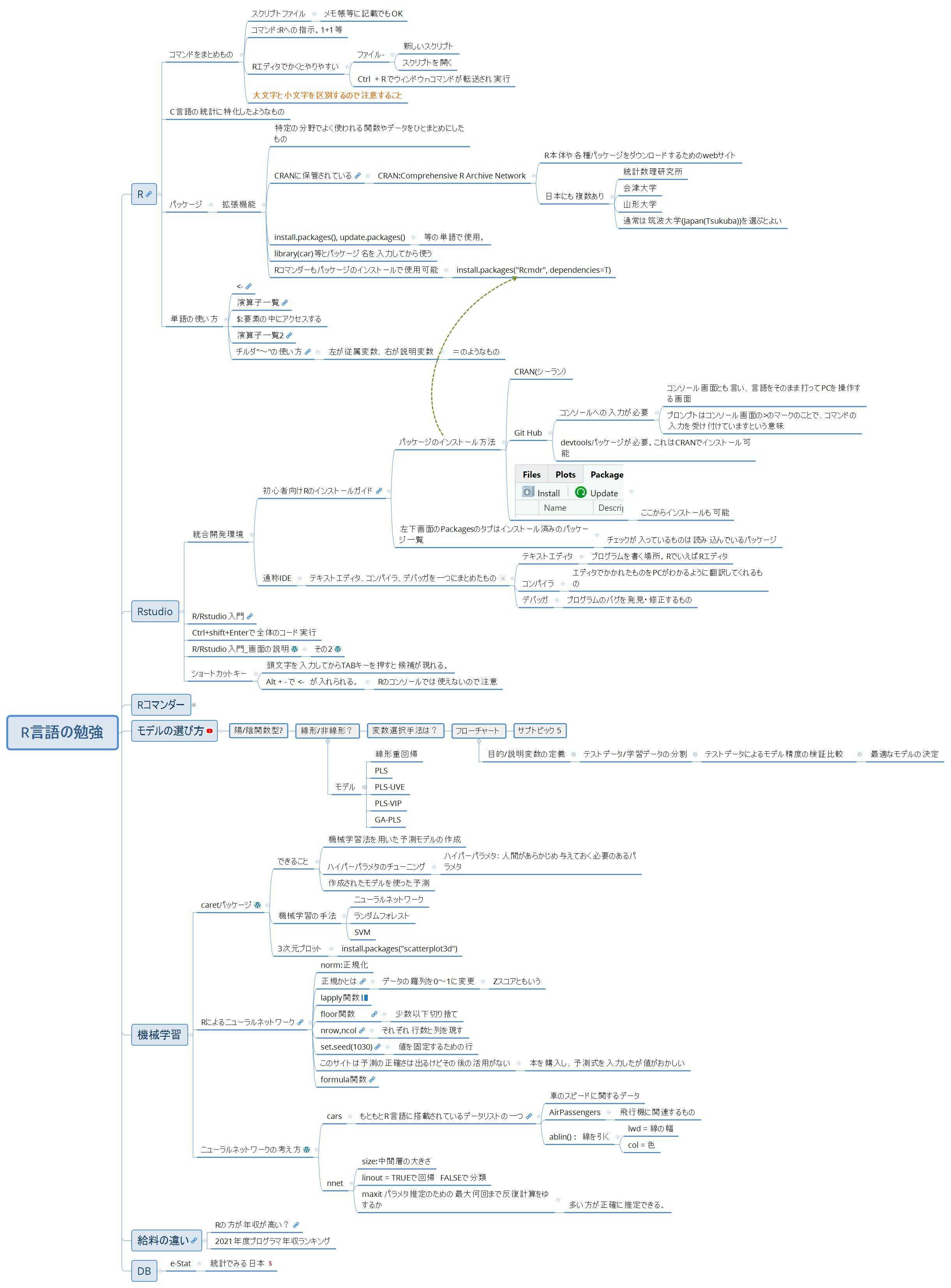 ネットを中心に勉強するとき、ここは参考になるなと思ったHPを一個一個お気に入りにするのって大変だなと思ってたので、Xmindを用いて勉強を進めています。Xmindはパソコンでマインドマップを書くためのソフトで無料で使えます。https://jp.xmind.net/マインドマップはある議題を中心に自由に言葉を連結させながら頭の中を整理するノート術の一種ですが、ツリー構造を活用して勉強としても使えます。一例をあげるとと、こんな感じで樹形図のようなものが広がっていく感じです。利点としては①ネットで見つけたいいなと思ったHPをリンクとしてそれぞれの単語の箇所に張り付けられる。②階層構造で作っていくので理解しやすい。③検索もできるので、思い出そとうとしたときに項目をすぐ発見できる。ですね。こういうマインドマップは手でかいた方がいいという人もいるかと思います。そういう考え方もあります。というか、マインドマップを手でかく場合はアイディアを出すための手法として使う場合ですね。思考の整理、勉強はPCの方がリンクを張れるし自由にツリーを変えられるので、こちらをお勧めしますね。今とりあえずこれで仕事をしながら3週間ほどでR言語の知識皆無からニューラルネットワークによる数値解析はできるようになりました。とりあえずこれは例ですが。誤差の数値がえらいことになってますが。このErrorが小さいほど予測性能が高いということです。上記のデータは色々はしょりましたので、まぁこんなもんかなと。