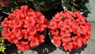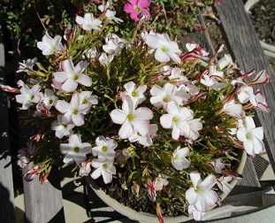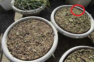 (リニフォーリアのプランター。円形プランター2個に約30球ずつ計約60球植えてあり、右奥のプランターで1本発芽した。)