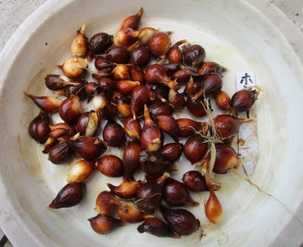 この球根は室内で陰干し保存して秋に再植付けする予定である。