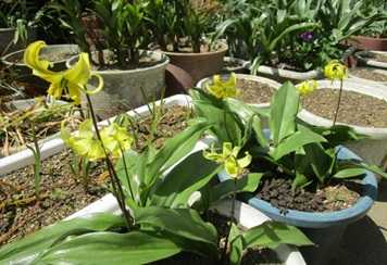 (掘り上げ前の黄花タカクリの鉢。8号鉢に5球と8球の計13球植えてあった。)