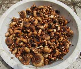 この球根は室内で陰干し保存して秋に再植付けする予定である。