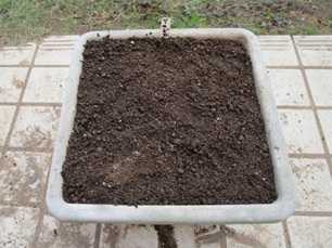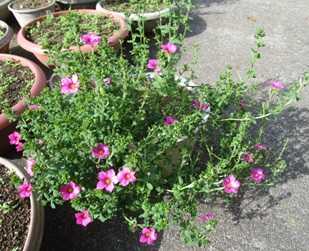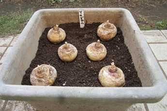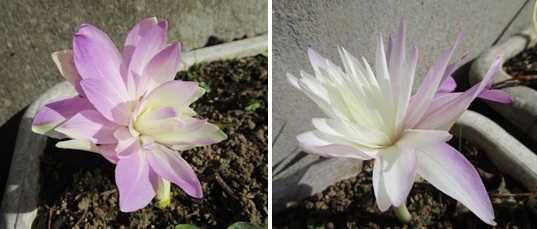 (八重コルチカム。標準プランターに14球植えてあり、左手前と右奥で計2輪開花した。)
