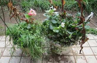 (こぼれ種のマラコイデスやベゴニアや雑草が生えている。)