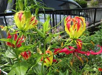 (掘り上げ前の赤のグロリオサの鉢。9号鉢2個に5球ずつ計10球植えてある。)