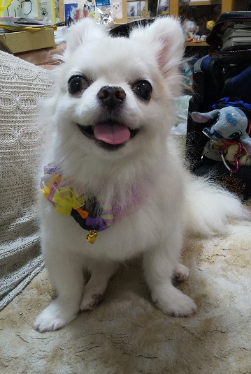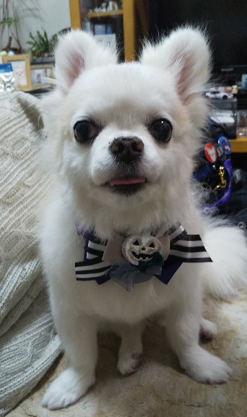 今月はシャンプー後の飾りがハロウィンバージョンになった翔です。