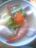 私の実家のお雑煮は 丸餅に白みそなんですよ。お餅は焼いてから入れます。鶏肉、大根、人参、里芋(^^)トッピングに三つ葉とイクラ。今年は特別に海老がのってましたっ!みなさんのおうちのお雑煮はどんなのですか~?