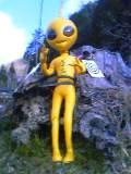 びっくりしました!水汲みに行く途中、ちょっと違う道を通ったら迷ってしまって…遭遇してしまったんです!!!大きな岩に縛り付けられ 身動きできない捕われた宇宙人に…。どうやら 2004年に地球にやってきたみたい。。。ちょっと内股ぎみなのがみょーにかわいい(^^)