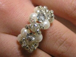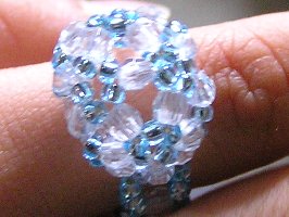 おたふく風邪になる前に、娘が作りました。 幼稚園児なので、集中力が続かず何日かに分けて作りましたが、やり切りました。以前、幼稚園の手芸サークルで保護者に教えた物(下)と、形は一緒です。 このリングは、40人近く参加したんだったかな?失礼ながら、大人になると、ちゃんと話を聞かないで勝手なことをするので、なかなかとんでもない間違いをしてくれる人が多かったです。それと比べると、ずっと娘のほうが要領が良かったのですが・・・子供たちが病気になる前に作ったリング。スワロのカンタローブを使ったので、色が変わります。まず、蛍光灯の下。 そして、太陽光の下。 どちらにも合うような色合いにするのって、難しいですね・・・