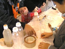 今日は、「青少年のための科学の祭典」というのに出かけてました。主催は「科学の祭典」高知大会実行委員会と(財)日本科学技術振興財団・科学技術館という、なんか、分かんない・・・けど、大学の研究室生や、小中学校の先生やら、四国電力やらの方々がお世話してくれてるらしい。40余りのコーナーがあって、実験したり、工作したり、講義をしたりと盛りだくさんです。今回、第9回で、私たちは3年前から毎年参加させてもらってます。初めてのときは何がなにやら訳も分からず、参加したい物があっても人も多いし、疲れただけで不完全燃焼でしたが、3年目にもなると、今年初めてのものや、去年出来なかった物に絞って、効率よく参加できました。2時間程度で、息子は「簡単なモーター作り」「電機を運ぶカチンコ作り」「地震計を作って、測ってみよう」「手作り望遠鏡」に挑戦。学生さんや先生などに助けてもらいながらじっくりと自分で製作、実験までさせてもらえるので、科学系の大好きな(って言うか、イベント好きって言うか、珍しいもん好きって言うか・・・)息子は大満足だったようです。娘にはまだ難しい物が多かったようですが、「プラトンボを飛ばそう」「液晶アクセサリーを作ろう」「小麦粉を作ろう」「ネイチャーゲーム体験」「海の底を覗いてみよう」「バランス紙トンボ」「静電気で遊ぼう」「空気砲」に参加して、楽しみました。大人も、ほほーと夢中になってしまうような物がたくさんあって、楽しいですよ。教科書とはひと味違う理科が楽しめて、お勧めです。きっと、来年も行く、再来年も行く。 地震計を作成中。 静電気の公演中。静電気を起こして、銀色の玉に触れると髪の毛が逆立つ。 というのを、右端にちらっと写っているおじ様で実験して、「前のほうの産毛が少し立ってますが、分かりにくいですねー。」というコント付き。