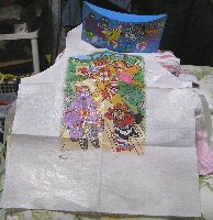 今度の日曜には、マクドナルドの体験があります。参加者全員エプロンを持参との事。ホットヌードルの懸賞賞品の親子エプロンが届かないかと待ってたのですが、来ませんので・・・作ってみました。娘が入園する前に、弁当袋とかリュックとか色々作るために布を買いました。その残り布が、ちょうど子供のエプロンサイズ。エプロンって、自分も普段着けないので、どんな形だったっけ??中学校の家庭科で初めて作ったのがエプロンだったなあ。あれって簡単だったような。古い古い記憶をたどりながら縫ってみました。先に言っておきますが、縫い物は苦手です。 作り始めると、火が付いてしまって、これだけで終わるのはもったいない。残ったハギレで作りました。 娘とおそろいのエプロンをつけたリカちゃん。 はっきり言って、あっちこっち滅茶苦茶です。こんな物でも、娘は嬉しいらしく、縫っている最中も横で「さあさあ、こちらに居るのは、ミシン美女のchamyさん、ミシン美女chamy-kinさんです!」(レポーター風)・・・ご機嫌取ってるのかい?でもね、その後向こう向いて小声で「美女といっても、本当ぉは美女ではないんですけどねー。」つったの、聞こえましたけどぉ!