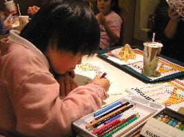 昔からレポートを短くまとめられないわたくしです・・・つづき・・・席に戻って、飲み物とポテトもセットで頂きます!実は・・・内緒ですが息子はちょっと味にうるさくて、マクドは苦手・・・でも、体験はしてみたい!事前に、無理して食べなくてもいいけど、「嫌い」とか、「おいしくない」は、禁句!と、言って聞かせてました。が、自分で作ったのが嬉しかったのか、「おいしー!!」と、大喜びで食べちゃいました。良かった良かった。2組目を待つ間、塗り絵をしたり、お姉さん達とおしゃべりしたりして楽しみます。 電話で対応してくれたり、当日担当してくれたお姉ちゃんに、歳を聞いてみた。「16ですぅ。」わかい!頑張ってて、偉い!もうね、電話の対応が、はちゃめちゃだったの、許す!!もう、それっくらい一生懸命、子供たちの相手をしてくれてました。そして、最後、全員そろってくじ引き大会。じゃんけんでくじ引きの順番を決めます。「じゃんけんぽい!!!」きゃああ、子供たち、全力投球の大声。 周りのお客さんたち、ごめんなさ~い!で、頂いたお土産。 子供の顔よりちょっと小さい位のクッションです。他にも、レターセットやシールなどが入ってました。マグカップが入ってた子もいたな。至れり尽せりの2時間。子供たちも、私も、大満足のイベントでした。マクドナルドの皆さん、ありがとうございました!他のお客さん、ごめんなちゃい!だいたい毎年何らかのイベントをやっていて、前回はパーティ形式でやったそうです。最後にアンケートに協力してくれって言うので、書いたけど、「どのようなイベントがあると良いでしょうか?」て質問・・・アイデアが出なくて、苦し紛れに「大食い大会」って、書いてみた。どう?「マック☆アドベンチャー」の、冊子も頂いたので、全国展開でやってる企画じゃないかな?皆さんも、地元のタウン情報誌など、チェックされてみては?