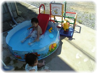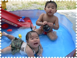 昨日の楽しかった(月ちゃんを除いて)プールデビューで気をよくした母。 今日はお友達を誘ってプールをしました 裏の裏の、大きなおうちのお友達です。 近所なのに全く会わないんですよね半年振りくらいに会いました。 ダイゴロと約1歳違い、月ちゃんとも約1歳違い。なんか『子供は苦手』とか言いながら、 超年子だったらこんな感じなんやなぁ とか 凄く楽しく遊びました。 また偶然な事に、お友達のママは和歌山市出身で、私達の実家は近く。 半年振りの話題は尽きる事なく… ふとダイゴロを見ると、なんか黒くなっていた 赤くなってなかったのに日焼けしちゃったのか?? 今までシロブタちゃんだったから、黒くなって、健康そうに見えて ママはうれしいデス 月ちゃんがうつぶせスタイルから自分でお座りが出来ました また1つ成長おめでとう