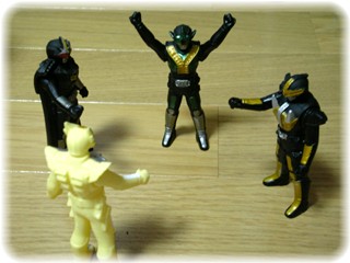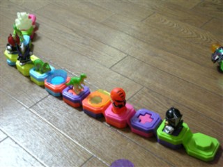 ウチのバカ夫婦は、只今電王バカになっておりますボンさんも珍しく、食玩を大人買いしてきたりするくらいにハマっている御様子(笑)先日、ヤフオクで値段が跳ね上がっている『デンライナー・ゴウカ』の1~4号車までを近所のスーパーで見つけたらしく、ホクホク顔で帰って来ました。でもこのシリーズのおもちゃは、値段の割によく出来た物で、家族でお気に入りだったりします。月ちゃんに関しては、味わったりして違う遊び方をするので即没収なのですがママはこんな事をして遊んだり。「ジャーン・ケーン・ポンッ」「俺の勝ちー」ママ的には高貴なウイングフォームがとても好きガオウにはとてもムカついた。渡辺さんがすっかりガオウに見えて仕方がないw