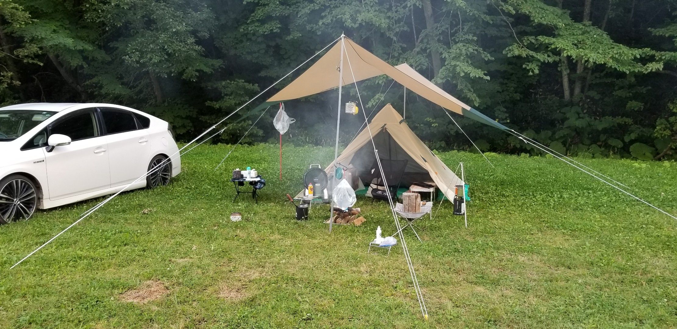 ソロキャンプ風景 そして この前のキャンプ飯 キャンプ場着いての何故か差し込み盛り合わせ 手羽先とフランスパンベーコン 餃子 ピザ擬き そして定番のカレー 朝に食べるカレーが一番好き‼️
