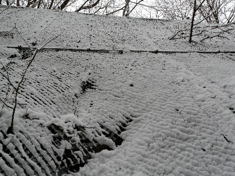 あの、謎の火薬庫跡(らしい)を後にして、水根沢を奥地へと進む自分。 すぐ脇にある側面の落石防護ネットを見ると、そのネットの細いワイヤーの上に・・・ まあ、なんて器用に雪が乗っているのでしょう!(笑) 恐らくこの谷筋は、昨晩は殆ど無風状態だったんでしょうね? おかげで、こんなところにまで雪が積もったみたいです。 と言う事はですよ! この先にある橋付きの砂防ダムも、結構真っ白になっているかもしれませんね!!(願) ワサワサとネットを揺らしてみたい気分ですが・・・ そうすると、ココに乗っている雪が全部自分のほうに落ちてくるので・・・(爆汗) って言うか、そのうち勝手に落雪してきそうな感じもしますからね! あまり見とれていると、大変な事になるかもしれません!!(慌) さ、さっさと先に進む事にします・・・ まだ続く!
