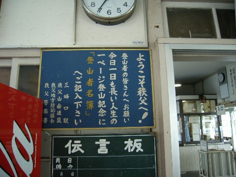 三峰山口駅編・ファイナル! 地方鉄道の終点なんて、こんな物なのかもしれませんが・・・ 切符の券売機。 たった1台だけの三峰山口駅(汗) ちなみにパスモもスイカもイコカも使えません! 確かに・・・ 信仰の地・三峰神社に向かうバスはココからではなく、西武秩父駅から出るようになっていますからね。 以前ほどの乗降客はいなくなっているのでしょうけど・・・(涙)。 でも、登山客の乗り降りは結構あると思うんですけどね? ま、とりあえず、駅の窓口でも切符は買えるようになっている様子ですが・・・ 紅葉シーズンなんて、乗客を時間内に捌ききれるのか? ちょっと心配だったりするんですけど(汗) とは言え・・・ さすがは関東の駅百選に選ばれただけのことはありますね! 何となく、いい雰囲気が出ています!! なお、ココでもう一つ。 最近見かけなくなったものを発見!! それは・・・ 画像の下のほうに少しだけ写っていますが・・・ 都心部の大きな駅なら残っているのか? 携帯電話の発展と共に、駅の片隅から姿を消しつつある伝言板。 いまだに、某番組を真似して「あの暗号」を書く人・・・ いるのでしょうか?(笑) と、色々と絶滅危惧なモノ? って言うか、昭和の臭いの残る三峰山口駅の話題なのでした。