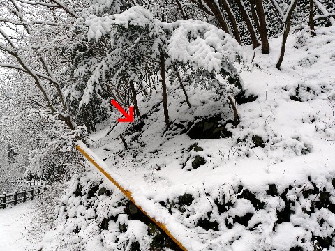 雪の水根沢を追え編。 元々、日当たりが悪くて寒い水根沢。 そのせいで一旦雪が降ると、なかなか溶けない場所だったりします(涙)。 ですから・・・ この奥にある橋付きの砂防ダム本体なら、結構な着雪があるのではないかという期待を抱きつつ遊歩道ほ先に進みます! しかも・・・ 自分が一番乗りという喜びを噛みしめつつ(笑) が・・・ 途中でとある事を思い出し・・・(汗) どうしても我慢できなくなってしまった自分!(滝汗) って、間違っても「もよおした」りして我慢できなくなったのでは無いですよ!(笑) けど・・・ この崖のところまで来て、どうしてもムズムズしちゃって・・・(笑) って言うか「ああっ、もうダメぇっ!!」(悶) でもココをよじ登ると、雪面に足跡が残っちゃうから・・・(汗) とか、自分の中のリミッターが作動しかけているのですが・・・ やっぱしダメでした(汗) ついつい我慢できなくなり、ココを登ってしまった自分。 ちなみに画像は、この崖を登った後、戻ってきた時に撮ったものです。 画像中の矢印付近の地面が見えている辺りは・・・(爆汗) 見事に足を滑らせて滑落した跡(恥) って言うか・・・ 良い子の皆さんは 絶対に真似しちゃ ダメだZO!! 雪の下は何が隠れているか判りません! それに元々から足元が悪い場所ですからね!(汗) ずるっ!っと、1mくらい滑り落ちた自分(滝汗) そこまでして見に行ったものは!? つづく・・・