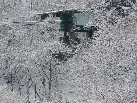 雪の奥多摩湖ロープウェーを追え編・ファイナル!! 9時を回り、ゲートがオープンしていた奥多摩湖周遊道路。 そんな理由があるとは露知らず、再びゲートまで戻ってきた自分(汗)。 とにかく! ゲートが開いていることに、一人勝手に喜び・・・ 中に入って、すぐ先の駐車場に向かいます。 すでに天気は急激に回復に向かい青空が見えています。 この場所は完全な北斜面で、ほとんど日が当らない場所ですから問題は無いのですが・・・ このままだと気温の方もソコソコまで上がってきそうです。 あまりゆっくりとしている時間は無いのです!! で・・・ とりあえず鉄塔の画像を撮った自分は、一番の目的である奥多摩湖ロープウェーが宙吊りになったままの斜面を見上げます!! が・・・ ここも木の枝に乗った雪がマジで邪魔!!(爆泣) ただでさえ周りの木が生長してきて、段々と見えづらくなってきているのに・・・ なお、最大望遠で見てみると・・・ たしかに木の枝の隙間からロープウェーのゴンドラが見えているんですけどね。 今までま傾向からすれば、確かに予想できたオチなのですが・・・(汗) ま、とりあえず、雪の日はこんな感じになるということが判ったらOKと言う事で・・・ なお今回は、三頭山口駅跡まで崖をよじ登るような事はしていません!(偉) 何しろ・・・ 水根沢で(仮称)火薬庫跡への斜面をよじ登る最中に滑落してますから・・・(爆汗) 同じ過ちを2度も繰り返すような真似は出来ませんしね!(笑)。 それに、この斜面は・・・ 一部に地下水が湧いている場所があり、冬場は凍結しているところがあるんですよ! その上に新雪が乗っていて、それが隠されていた日には・・・(滝汗) 間違って、その上に乗ってしまった日には大惨事になりかねませんからね!! とりあえず今回は、ここまでで撤退する事にします。 そしてこの後・・・ 秩父方面まで「雪のダム」を追いに出かけたてたりする自分。 そのことに関しては、また後日・・・ さて、これから引越し作業のため電話回線の移転を行います。 そのため、引越し先での接続作業が済むまで間、明日から暫く休載します(涙)。 それでは復帰後に、またお会いしましょう!!