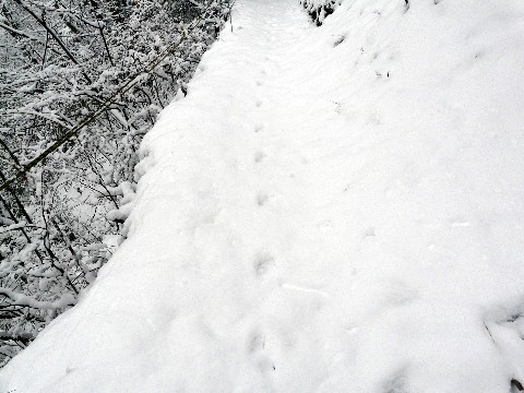 小河内ダムが正面から見える場所へと向かうべく、朝早くから山の中に入ろうとした自分。 しかしどうやら、先客があったらしい事に意気消沈(涙) と思ったんですけどね! いざアプローチルートに入ろうとしてみたら・・・ 足跡が付いていないキレイな雪面が広がっています!!(嬉) って言う事はですよ! まだ例の場所には、誰も足を踏み入れていない!(喜) 先ほど停まっていたハイラックスサーフのオーナーさんは、違う場所に向かったという事? わざわざ4駆なんかで来るくらいだから、てっきり山の中に入るのかと思い込んでいたのに・・・(汗) ま、もうそんな事は、どうでも良くなった自分!!(笑) 新雪を「キュッ、キュッ」を踏みしめる音を一喜一憂しつつ・・・ って言うか、こんなんで喜ぶなんて、自分の頭の中は幼稚園児並か?(滝汗) さ、とにかくこの先に邪魔者はいません!(喜) 慌てると滑って転ぶ危険性があるので・・・ そして後から来る人もいませんから、周りの景色も堪能しつつ・・・ 自分だけの雪道(?)を堪能しながら・・・ と・・・ 暫くすると、タヌキやウサギの足跡が雪面に残っていました! ちっ! 野生の動物には先を越されたか!?(悔涙) でも、人間としては一番乗りだ!!(叫) って言うか、何だか物凄くハイテンションな自分(爆) さ、ダムが見える位置まで、あと30mくらい! さ! 1年前のリベンジは成就するのか!? 手に汗握る次回は!? たぶん、余計な引張りが入るんだろうなぁ?(汗) だって「お約束」だもん・・・(笑)