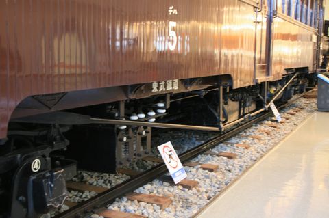 年末の慌しさと、なかなか治らない風邪のせいで更新が遅れ、終われなくなりかかっている東武鉄道博物館編(困)。 でも日程の関係で、今日で強引に終わらせます!(困) って言うか、色々とネタは残るけど打ち切り御免???(涙) さて・・・ 東武鉄道博物館のメインと言えば??? 画像のデハ5と呼ばれる、戦前の木造電車。 正面の5枚窓が特徴で・・・ 微妙に流面系。 それを復元したものが展示されています!(凄) しかもですよ! どこかの地下鉄博物館の復元品と違って、安物の木(ベニヤとか)を使っていません! かなり本格的に作業をしています。(部分的に鋼体化されていますけど) で・・・ このデハ5。 戦前の木造電車の特徴をしっかりと残している貴重な存在だったりするんです!!(凄) 今の電車と違って当時は・・・ 基本構造は貨車の延長線上にあるんです! 鉄製シャーシの上に、木で造った車体を乗せるといった構造・・・ 画像の「東武鉄道」と書かれている鉄骨の部分がシャーシです。 その上に木の板を並べて外壁を造った車体の様子が見て取れると思いますが!!(凄) そして、シャーシの強度を保つために、床下にトラス棒と言うものが設置されているのが木造電車の特徴です!! これが無いと、床下にぶら下がっているコンデンサーや電気機器の重量でシャーシが曲がってしまうので・・・(垂) 更にです! シャーシの上に車体を乗せた構造の影響は、乗り降りをするドアにも影響が出てきます!! シャーシのフレームの厚さ分だけ床が上がってしまうので・・・(涙) まるでステップが付いたように状態になります! って言うか、ドア付近に寄りかかって乗るのは困難??(笑) ま・・・ 元々、当時の駅のホームは物凄く低かったですからね! ステップ状になっていないと乗り降りできなかったのもあるのでしょうけど?? そして更に!! 車体が木で出来ていますからね! 屋根や天井に重いものを取り付けられませんから!!(泣) 最低限の明かりとか取れない車内。 もちろん扇風機なんて贅沢な装備はありません!! ダブルルーフと呼ばれる2段屋根の隙間に取り付けられた明り取り用の窓と、通気用のベンチレターで、車内の明るさと空調を補います! って言うか、走らないと空気が入ってこない? 雨の時は雨漏り必須?? 何にせよ、こう言った貴重な資料を復元してくれた東武鉄道博物館。 なかなか濃いところがあります! が・・・ その貴重さを分かって見に来る人は、どれくらいいるのかが心配・・・
