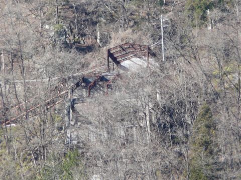 日原・鉱山編2009末。 さて・・・ 日原街道から鉱山のほうを見ていた自分。 前回、新緑の季節に来た頃・・・ 思いっきり勘違いをしていたことに気づきました!(慌) そう! 画像の廃索道施設。 てっきり解体されてしまったのかと思い込んでいたのですが・・・(恥) ちゃんと残ってましたよ! 周りの木の葉が落ちたら、その姿を現してきました! でもです! 約3年前と比べて、外から見えづらくなっているのも事実! 想像以上に周りの木の生長が早いって事みたいです! そのうち、冬場でも木の枝に隠れて見えなくなってしまうのかもしれません(涙)。 ちなみに画像は新緑の頃のものです。(隠) しかし・・・ その昔。 まだ日原に車が通れる「まともな道」が無かった頃・・・ この索道施設から氷川駅(現JR奥多摩駅)まで索道を使い、ゴンドラで石灰石を運んでいたと言われています!(驚) 空中を飛び交うゴンドラ輸送??? 一体、どんな光景だったのでしょう?(望) 当時の写真、見た事がないんですよね!(悔) あれだけ丈夫そうな施設を造る位ですから、相当栄えていたんでしょうね、この鉱山。 ちなみに・・・ このヤマで働く人たちのために造られた社宅。 って言うか村が、山中にあった時代も存在したそうです!(凄) 東京の廃村として結構有名だったそうですよ!! ただ・・・ これも3年ほど前に、すべて解体されてしまったそうで・・・(涙) つづく。