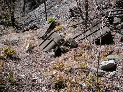 登竜橋の眼下に広がる日原の谷。 ここ数年、大規模な崩落が発生していないから木の生長が著しく・・・ ソコに眠るモノたちを覆い隠すようになって来ました。 つい一昨年までは、目を凝らせば色々と見えてきたのに・・・ この谷底。 その昔は、しっかりとした路盤があったのかもしれません。 もしかしたら木橋が架かっていたのか? そして、ソコに乗っていたはずのモノ達が、谷底に散らばりながら眠っています・・・ とある人はココを「鉄の墓場」と称した事もあります。 半分土砂に埋まりながら辺りに散らばるトロッコ達の残骸(涙) へし折れたレール(線路)の姿も見え隠れしています そして・・・ それを引っ張っていたバテロコ(バッテリー式機関車)も谷底に!! 一体この場所で何があったのでしょう? なお・・・ 画像を見ていても分かると思いますが・・・ この辺り。 あまり草が生えていません。 って言うか、常に小規模な落石があるので草が根付かないんです!(焦) 興味本位で見に行こうとは絶対に思わないでください! 冗談抜きに危険な場所です。 浮石も多いので、歩くのも困難を極めます! 軍手等、何かしらの手袋をしていないと・・・ それこそ、両手両足を使わないと進めない様な場所もありますから!!(怖) 運転手さんが乗っているときに落ちていないことを祈りたい気分です・・・