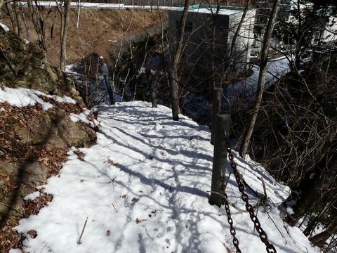 名前を忘れたしまったけど、岩の割れ目に流れる小菅村の滝。 ソコを目指して、雪の坂道を下ることになった自分。 そして何故か・・・ 遊歩道として作られた部分のみ、しっかりと雪が残っていて!(泣) って言うか、雪の下に何があるか分からない!(焦) って言うか、雪自体が凍結している危険性も!!(滑) と、思い・・・ ビクビクしながら道を進む自分。 ただ・・・ 不思議なことに、その雪はとても柔らかく・・・ 踏みしめると、音を立てながら沈み! って言うか、物凄く歩きやすい!(嬉) とは言え、油断すると表面に乗った雪の下に凍結箇所がある可能性が無いとは言えないので、気を抜くわけには行かないのですが・・・(怖) 画像を見てもらっても分かるとおり・・・ 結構、傾斜がキツイんですよ!(涙) 本当! 凍っていたら、怖くて進めないくらいの角度です!!(落) 暫く進むと・・・ すぐ脇の方から水の落ちる音が!! って言うか、滝がすぐ真下辺りにあるのが分かります! しかし!(悔) くっ!(悔) 角度が悪くて見えない! って言うか、目の前の斜面が邪魔!!(涙) 無理に乗り出すと、足元が凍結しているかもしれませんし、崩れる危険性もあります!(落) 音はすれど姿は見えず! しかも無理は利かず!! 仕方ないです! もっと坂道を下って、見学できそうな場所を探します・・・ つづく。