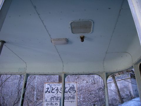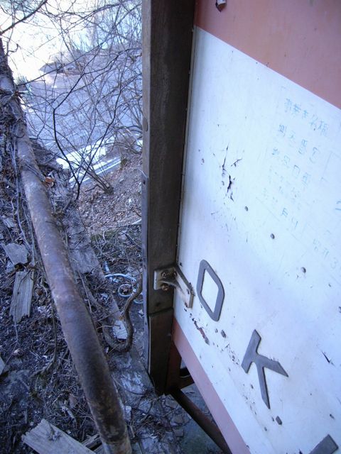 さて画像は・・・ 三頭山口駅跡内に残る奥多摩湖ロープウェーの名盤。 最大輸送人員36名。 って言うか、あのロープウェーに36人も乗れたのか? って言うか当時は、そんなに乗客があったのか? 一応・・・ 元・従業員さんの話では、開業2年目くらいまでは結構な利用者がいたそうです。 三頭山への登山口として・・・ 湖の向こうにある駐車場(現在では都営無料駐車場として昼間だけ開放中)まで、観光バスなどが乗り入れていて・・・ 都内の実業家さんが描いた通りの繁栄をもたらしていたそうです。 が! 新しい橋が完成して右岸と左岸を自動車が通れるようになってから・・・ 一気に利用客は減少。 そのまま廃止へと向かったそうで・・・(涙) それにしてもです! 非常灯しか照明が付いていない車内(暗)。 冬場は一日中、殆ど陽の当たらないこの場所。 日没だって結構早い!! って言うか、地元の人たちの帰りも早い? 更に!! 椅子一つすら付いていない車内。 たった6分で渡り切るとは言え・・・ もちろんロープウェーですから、空調なんて装備されていない? って言うか当時、まだエアコンなんて高価な物は殆ど存在していないですし、奥多摩は夏でも涼しかったですから!(逆に冬は物凄く寒いけど) その上、窓はハメ殺し!!(苦) 利用客が減っていく理由も分かるような気もします(涙)。 ちなみに・・・ これに36人乗れるのではなく・・・ 18人ずつ、2台で36人と言う事なのでしょう?? そして・・・ これらの画像は、窓の外から撮っています。 って言うか、これに乗るのはマジで危険!!(焦) 乗った反動でワイヤーが切れるようなことは無いでしょうけど!!(怖) もし切れたりしたら!!(叫) 眼下の人たちに多大な被害をもたらしてしまいます!!(壊) ま、それ以前に・・・ 真ん中の鉄棒の付け根辺りの床。 何か色が変わっているんですけど!!(腐) 下から覗き込んでみると・・・ って言うか、改めて画像を整理していたら気付いたのですが!(汗) なんか、真ん中辺り・・・ 錆が進行して、床が腐食しているように見えるんですけど!!(抜) 間違っても、興味本位で乗ったりしないようにしましょうね!