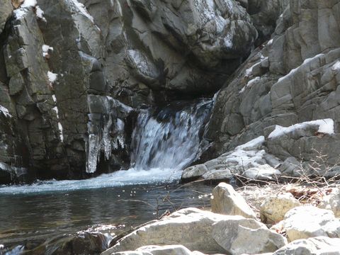 岩の割れ目を、うねる様に流れる滝!(美) 見える範囲は、とても狭いですが・・・ でも、良く見てみると、結構凄い物があります! 自分の撮影技術がマトモなら、もっと迫力のある画が撮れるのでしょうけど?(悔) そして、ソコに流れる水は! 多摩川の源流の称号を、塩山市(現・甲州市)と長きに渡って争ってきただけの事はあります! 物凄く済んでいて、そして綺麗です! そして・・・ 見ているだけで、その冷たさが伝わってくるような!!(凍) って言うか、手を入れようものなら! って言うか、5秒も入れるのは不可能だろうな!(笑) そんな事したら、確実に凍傷になりそうな気がするZO! 周りの岩には、撥ねた水で氷柱が出来ていて!!(凄) 水温だけでなく、周りの気温の低さも表しています! って言うか、あまりの寒さに・・・(震) デジカメのバッテリーの消耗が激しくて!!(焦) 朝、フル充電したばかりなのに、すでにゲージが1つと2つの間を行ったり来たりしてるし!! ちなみに、この画像は・・・ 帰りしなに、途中で撮ったものですが・・・ とにかくです! マジで寒いです! とりあえず、良い子の皆さんは・・・ あまり真似しないようにしましょうね! でも・・・ この寒さがやめられない! 「生きてる」って感じがして、やめられない! で、バイクで来ちゃったりするんですけどね!(さすがに徒歩でしか進めない場所は無理しませんが) って言うかM?? まだ続く。