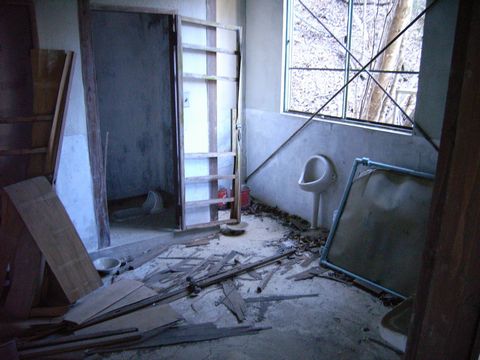 三頭山口駅跡の中には・・・ って言うか駅ですからね! 人がロープウェーの発射待ちとかする訳ですし! 登山客が出入したいた訳ですし!! ちゃんとトイレがありました。 って言うか、今ではトイレ跡ですが・・・ でもね・・・(怖) この状態・・・(震) 何かマジで怖いんですけど!!(泣叫) 入ったら、便器から手が出てきて!!(叫) 中に引きずり込まれちゃいそうな雰囲気が漂いまくっているんですけど!!(幽) 真冬の冷たい空気が、その恐怖感を益々増徴させちゃってくれていて!!(涙) って言うか、間違っても暗くなってからは来たくないです、ココ!(滝涙) 小さい頃・・・ 一人でトイレに行けなかった恐怖感(震)。 何かトラウマのように出てきちゃうんですけど!!(泣) とにかく自分・・・ この画像を撮った位置から、一歩も前に進むことは出来ませんでした! って言うか、何かが「入っちゃダメ」と言っているような気がして!!(怖) って言うか、本当に別次元の空間? って言うか、「・・・」な時空?? ま、何にせよ・・・ 思い出すと、今晩から一人でトイレに行けなくなりそうです・・・(打震)