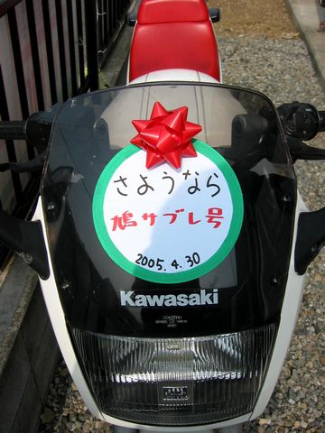 ココのところ・・・ って言うか去年の10月下旬頃から、ココのクオリティ落ちてます!(汗) 文字数も減っていますし・・・ 内容も中途半端になりかけ? 仕事の通勤時間の関係で? 頭が回りきらずに、ギリギリで更新してたりしますから!(困) そして今日・明日は「リメイク・さよなら鳩サブレ号編」。 またも過去に消してしまった画像を使ってのリメイク版です! 決して手抜きしているわけではありませんよ!!(焦) 今から約5年前。 当時乗っていた鳩サブレ号ことGPZ250R。 その引退の日に、こっそりと行われたイベントの話??(笑) 近所の人に見られるとマジで恥ずかしいので、前の日の夜に仕込んでおいて・・・ 日の出と共に開始! 朝5時。 まだ、周りの家の人が起きてくる前に開催したんです!! さて、その内容とは?? ちなみに、何故に「鳩サブレ号」なのかと言うと・・・ 横から見た形状が良く似ているから!(笑) 本家本元の鳩サブレーも競演! って言うか、食べ物を粗末にしちゃダメです??(笑) つづく。