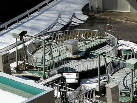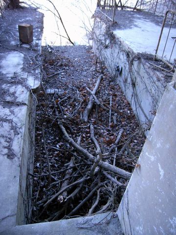 さて、ココまでどうやって上がってきたかは秘密です! だって、直登ルートよりは安全とは言え、かなりの危険を伴いますから!(落) とにかくです! 良い子の皆さんは絶対に真似しないでください!!(願) とりあえずです! 一旦、少し上のほうから見下ろせるような位置まで上がり・・・ ソコから下って、目の前のフェンスを跨いで駅に入るのが一番の安全策。 現役稼動時なら、確実に「無賃乗車未遂」で捕まってしまいますけどね!(笑) が! この手前にも罠が潜んでいるんですよ!!(焦) って言うか、この足元の巨大な氷の塊は何??(焦) 夏場は氷ではなく、ヌカルんだ湿地と化しているかもしれませんが・・・ コレが枯葉の下や、新雪の下に隠れていたら!!(叫) 知らずに踏み込んだ足元。 全く予期もしないアイスバーン。 しかも結構な急傾斜!! 確実に転ぶ上・・・ 転んだ時に打ち所が悪いと!!(痛) 実はコレ。 旧・三頭山口駅の給水施設跡のようなんです! 完全に捨てられた町営水道。 冬場の凍結で、水道管が破裂して!(壊) そこから出た水が凍結しているようなんです!! とにかくですよ! 色々と危険が待ち受ける奥多摩湖ロープウェー跡。 興味本位で出かけるのは絶対にやめましょうね!