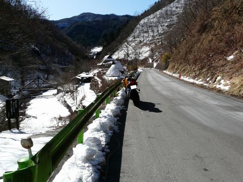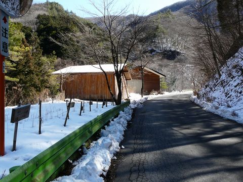 先程おあいしたオネイサンの話によると・・・ 実は、もう一つ! 少し先に進んだ場所に「雨ごいの滝」と言うものがあるらしい!! これも、中々の滝なのに、あまり知られていないのだと! 実際・・・ この先の道は・・・ 北斜面に沿った完全な日陰区間を進むので、残雪や凍結の恐れがあり・・・(怖) はっきり言って、エフハチで進むのは、かなり危険なものを感じるのですが!!(焦) でも、せっかくです! 以前の仕事では、小菅村の人々にお世話になっていますからね! って、全然関係ありませんが!(笑) せっかく紹介していただいたのですから! 行けるだけ行ってみましょう! 最悪の場合・・・ ツンツン走りって手もありますし!(転) で、画像が・・・ 目印となる、新しく出来た建物。 って言うか、本当につい最近出来たものかと? だって、一昨年には無かった記憶が! 去年は、確か建築中のものを見た記憶がありますし!! ちなみに! 道路は、一応除雪してありますが・・・ ガードレールの向こうは、完全な雪! って言うか、このニョキニョキと出ているものは何?(謎) と思ったらですよ! 何やら看板げ名物が立っています!! そこには・・・ どうやら、この場所に桜の苗木を植樹した人の住んでいる地域が書かれている! って事は! この、頭だけ出ているのは桜の苗木!! って言うか、苗木の高さが1m位だとして・・・ って言うか雪。 実は物凄く積もっているの!?(焦) 確か、この雨ごいの滝と言うのは、この崖下にあるという話だった記憶が!!(困) って言うか、ええっ!!(叫) もしかして、こんなに雪が積もったところを降りなきゃいけないの??(涙) さぁ。 どうする自分!!(困) デジカメのバッテリーもヤバイ状態ですし、今回は無理せず撤退するのか!? それとも・・・ 面白そうだから突き進むのか!?(呆) 次回、その答えが???